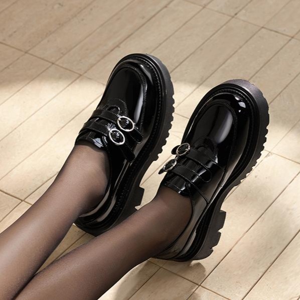 クラシカルな雰囲気を醸し出す金具デザインと、モダンな厚底の組み合わせが魅力的なエナメルローファーです。
