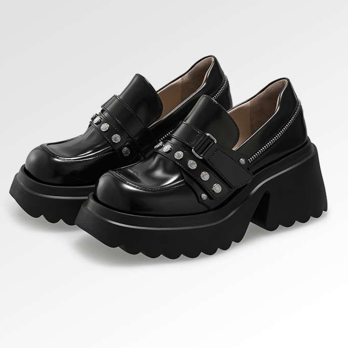 スタイリッシュなスタッズとベルトデザインが特徴的な厚底ローファーは、黒ストッキングとの相性が抜群です。