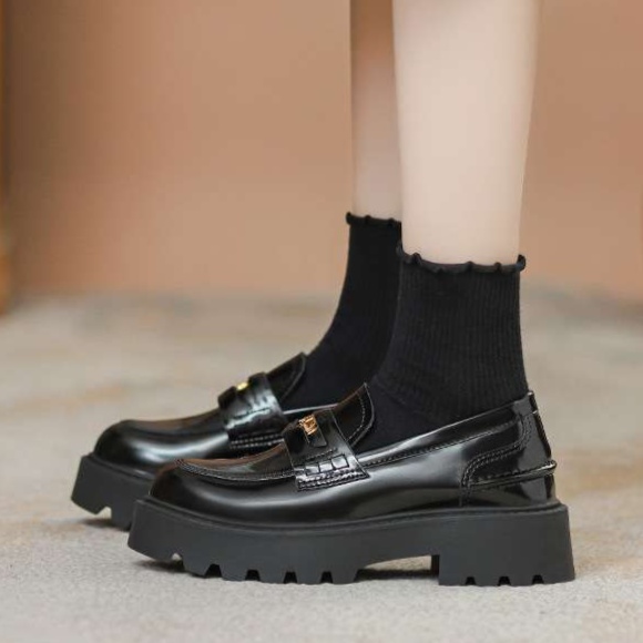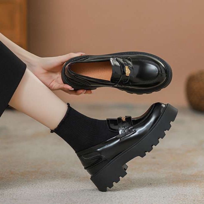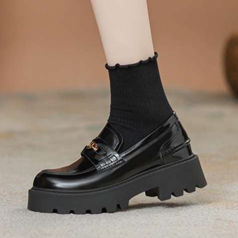 厚底ローファーは、ローファーレディースの定番に現代的なアレンジを加えた一足。艶やかな表面と金属装飾が上品な印象を与え、厚底のギザギザソールがトレンド感を演出。履き心地の良さと洗練されたデザインが魅力で、デイリーコーデを格上げするアイテムとして最適です。どんなスタイルにもマッチし、あなたのファッションを引き立てます。
