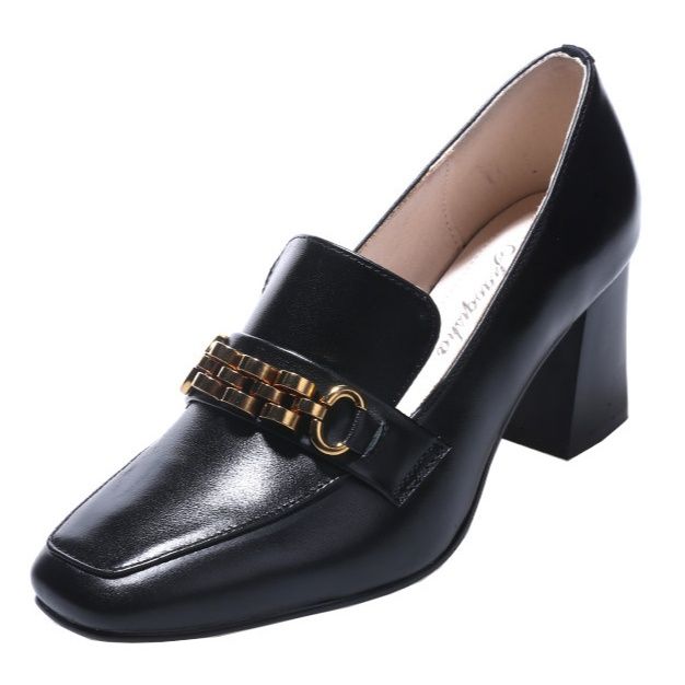 上品な光沢感のある素材とゴールドのチェーン金具が目を引くヒールローファーです。