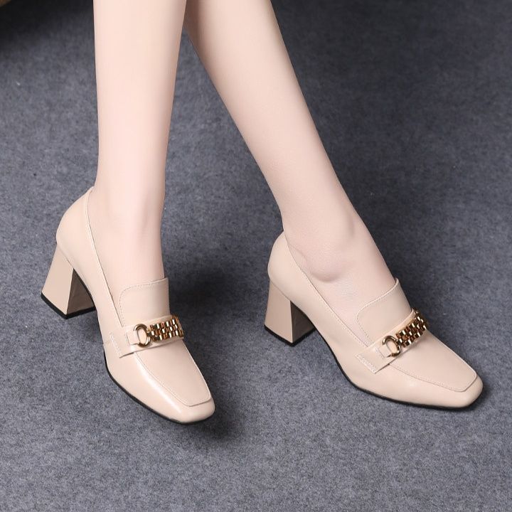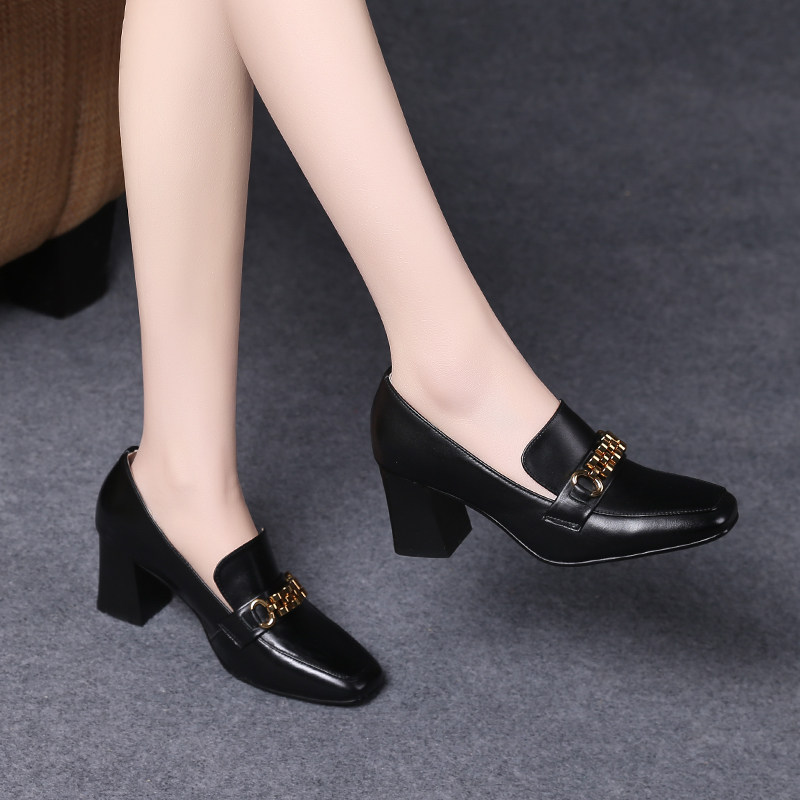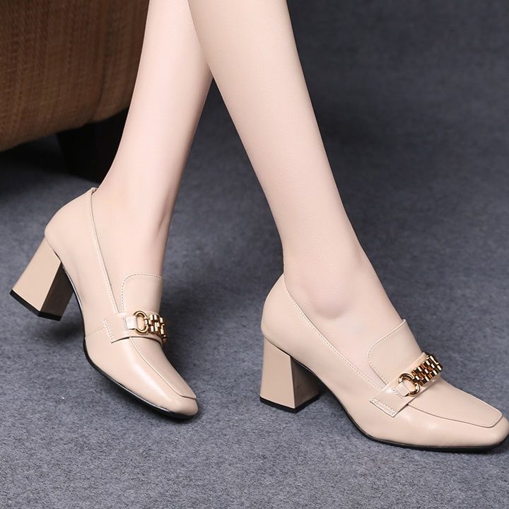 太めのブロックヒールが安定感を提供し、長時間の着用でも疲れにくい設計になっています。